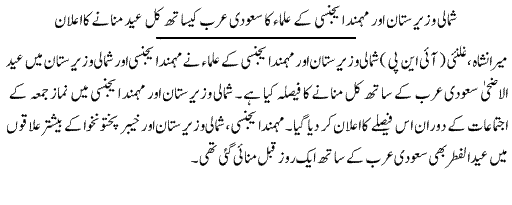 Eid Will Be Celebrated Tomorrow In North Waziristan along with Saudi Arabia.